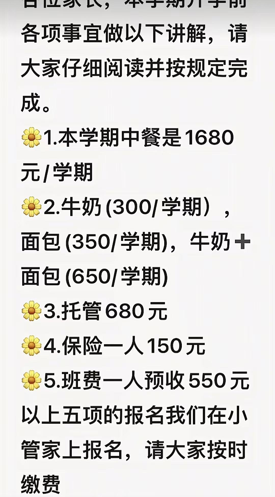 看得出来,这是一所托管学校,孩子午饭在学校吃,仅仅一顿午饭这学期就1680元,这个价格看起来并不低,不过最触动人心的是那550元的班费。