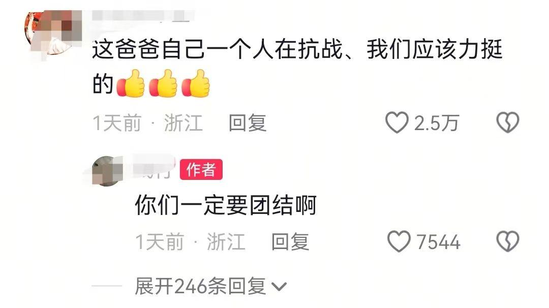 有网友说这位家长在给所有有孩子的家庭争取光,而家长也回复了这位网友只有大家团结一起才能争取到最后的光。