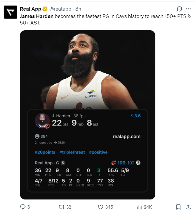 2.哈登成为骑士队史最年长连续三场比赛20+的球员;